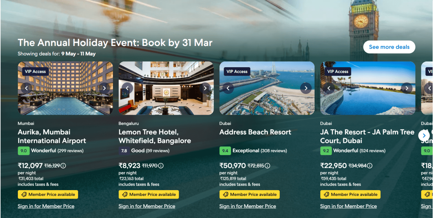 - Check the ‘Deals’ Page – Expedia’s homepage features daily discounts on hotels, flights, and packages.